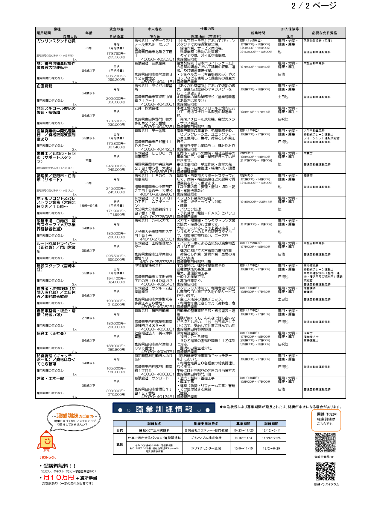 ・掲載している求人情報は発行日前の1週間分の求人一覧です。安定所では、随時紹介を行っていますので、すでに採用決定済みの場合もあります。ご了承ください。