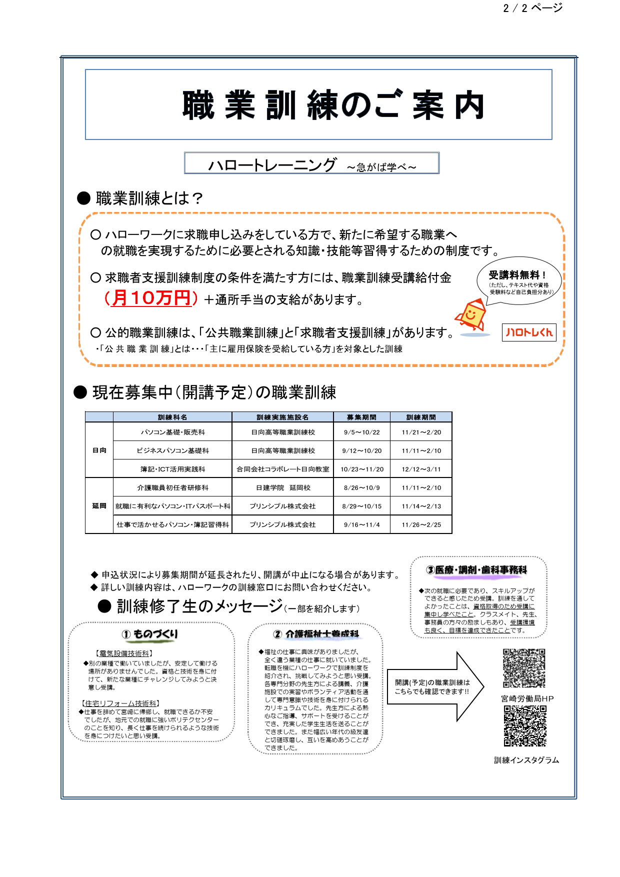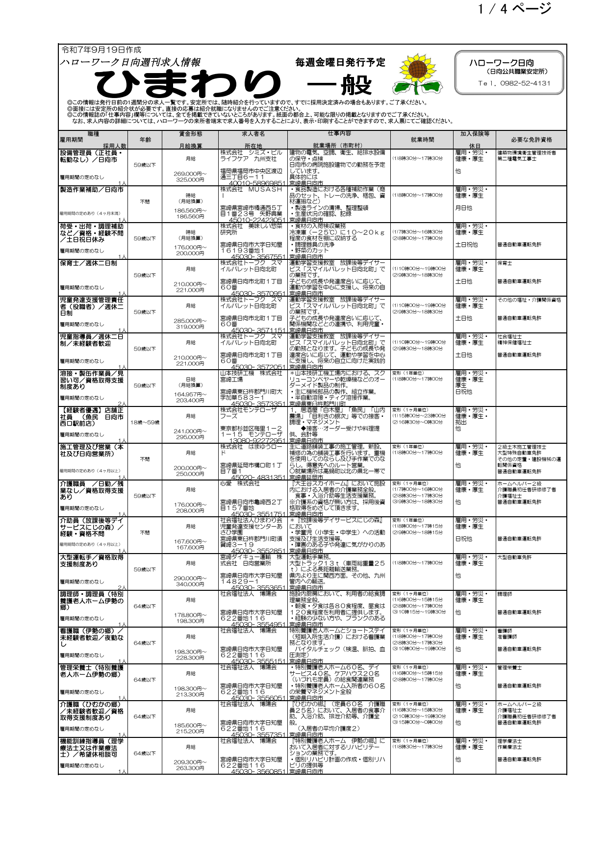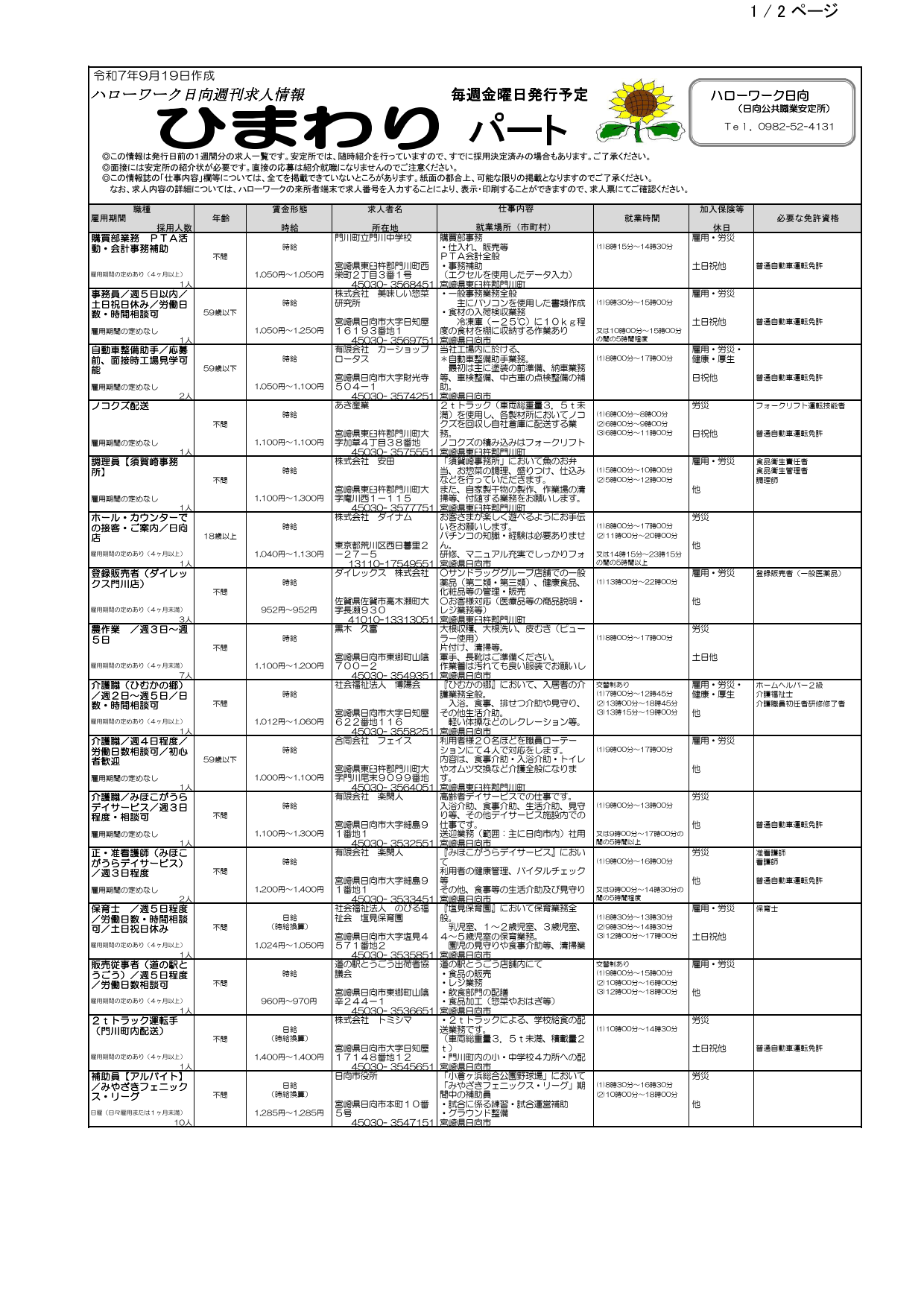 ハローワーク日向求人情報(フルタイム、パート)R7.9.19(金)発行