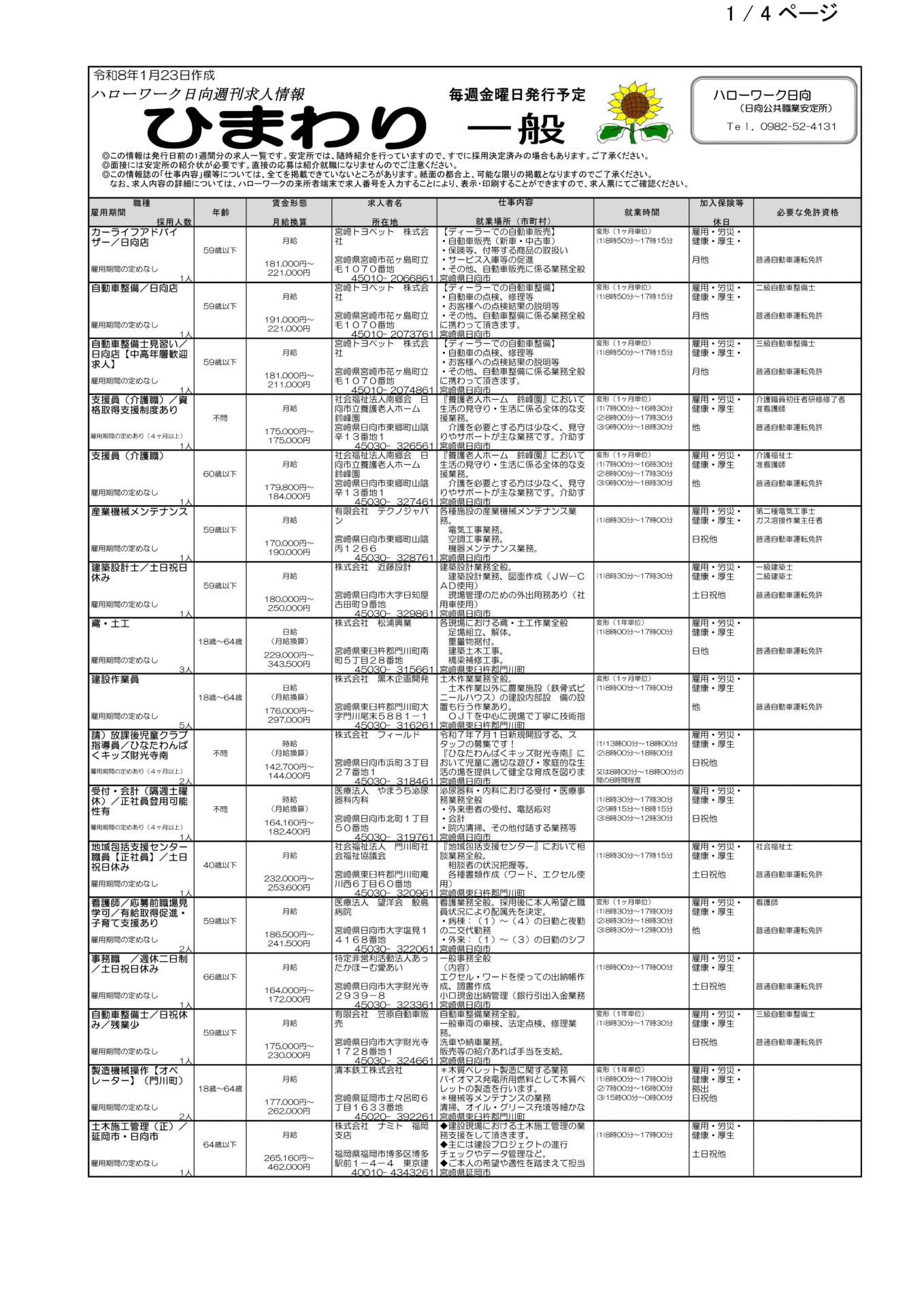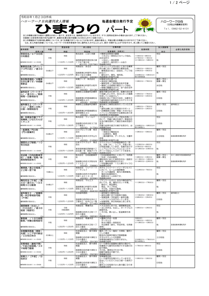 ハローワーク日向求人情報(フルタイム、パート)R8.1.23(金)発行