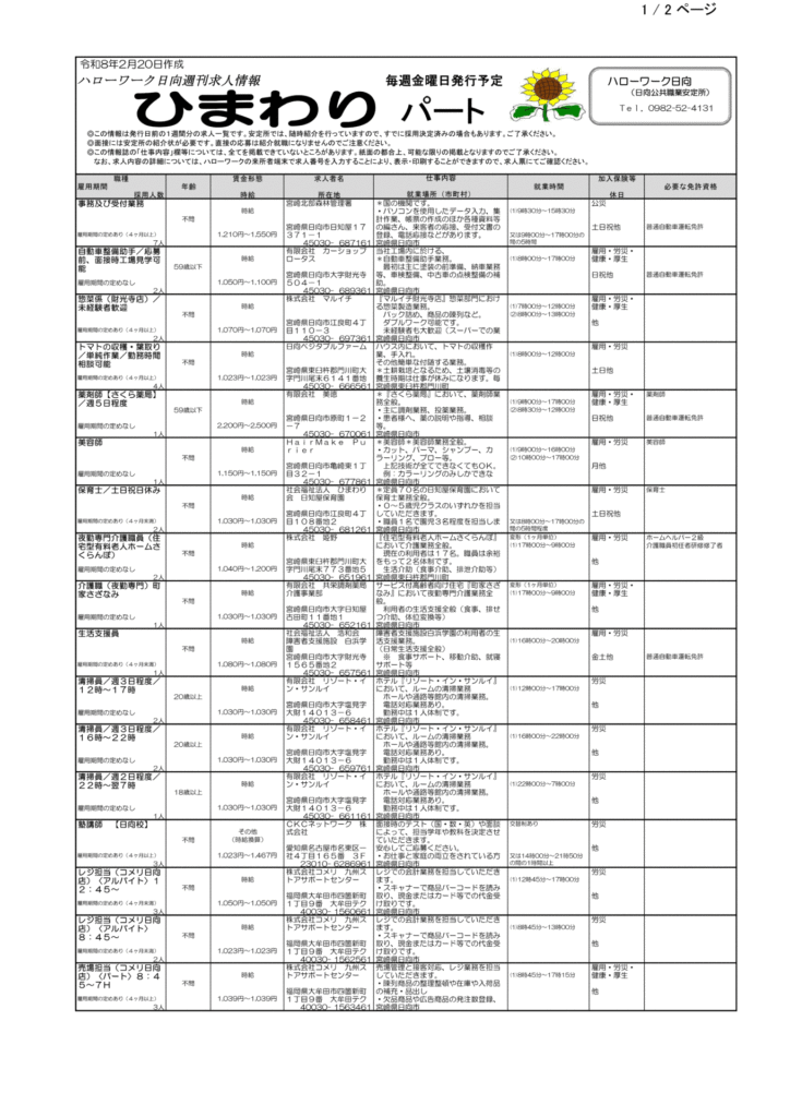 ハローワーク日向求人情報(フルタイム、パート)R8.2.20(金)発行