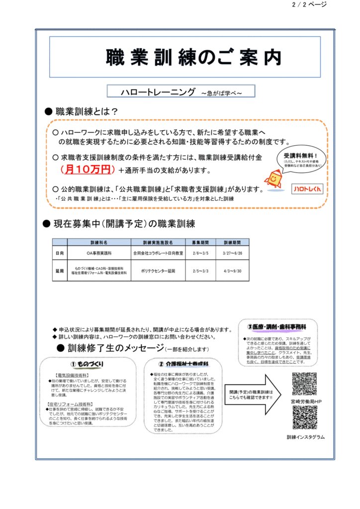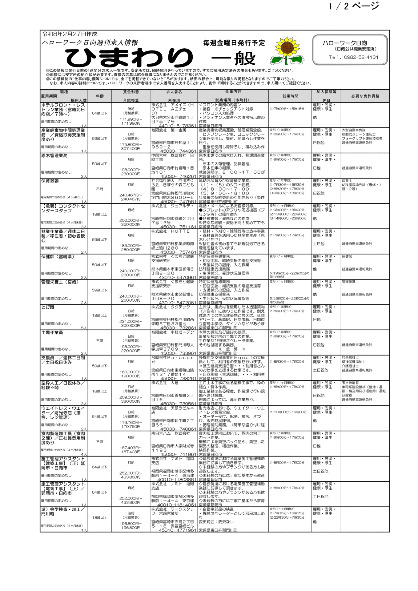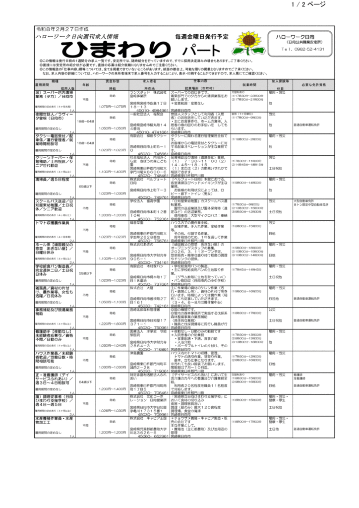 ハローワーク日向求人情報(フルタイム、パート)R8.2.27(金)発行