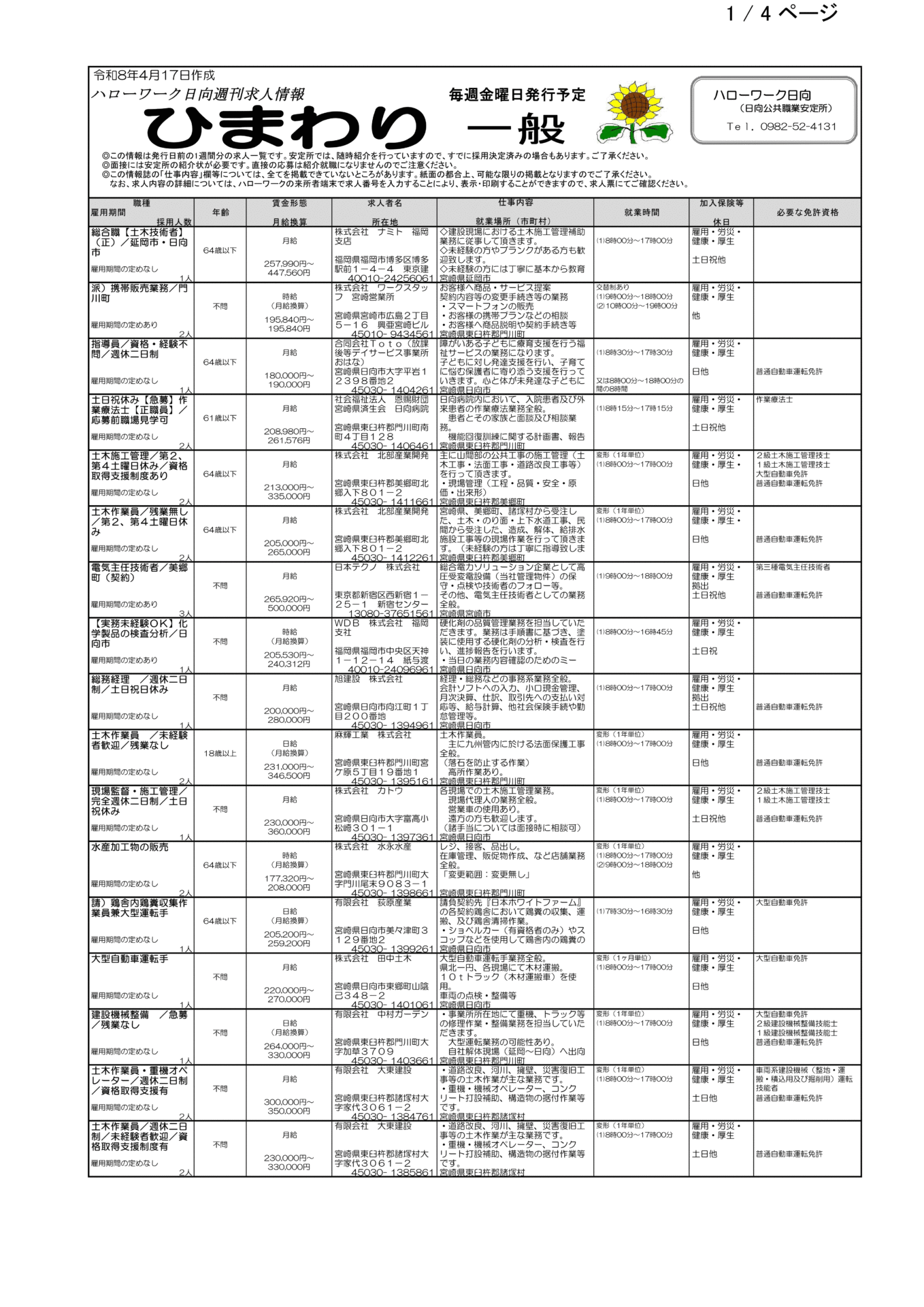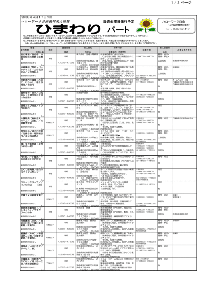 ハローワーク日向求人情報(フルタイム、パート)R8.4.17(金)発行