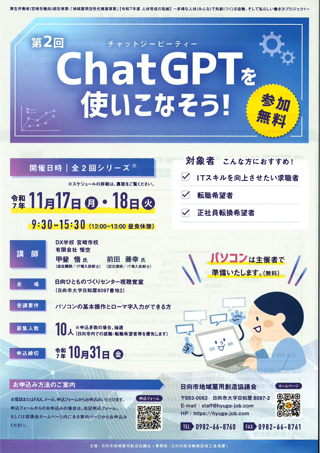 求職中の方にお知らせ \ セミナー参加者を募集します! / ● 参加費無料 ● PCは主催者で準備 情報整理や文書作成の効率化に役立つChatGPTが学べるセミ…続きを読む |