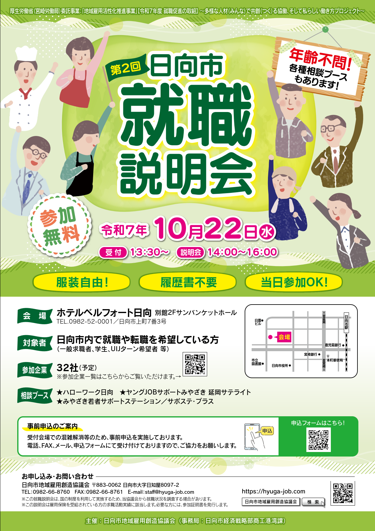 就職活動中の方にお知らせ \ 日向市就職説明会を開催します! / ● 参加無料 ● 年齢不問 ● 履歴書不要 ● 服装自由 ● 当日参加OK ● 参加事業所3…続きを読む |